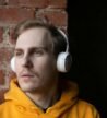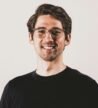 A person wearing a black cap and a black polo shirt with a courier service logo holds a large cardboard box. The background is a plain light gray, and the person appears to be smiling slightly.